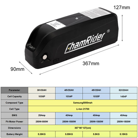 ChamRider E-bike Battery For Rear Rack Model C Extended Battery 36V 48V 52v 15AH 20AH Samaung50G cell Electric Bike Bicycle Battery for Bike Lithium Li-ion Battery Pack Bafang ChamRider